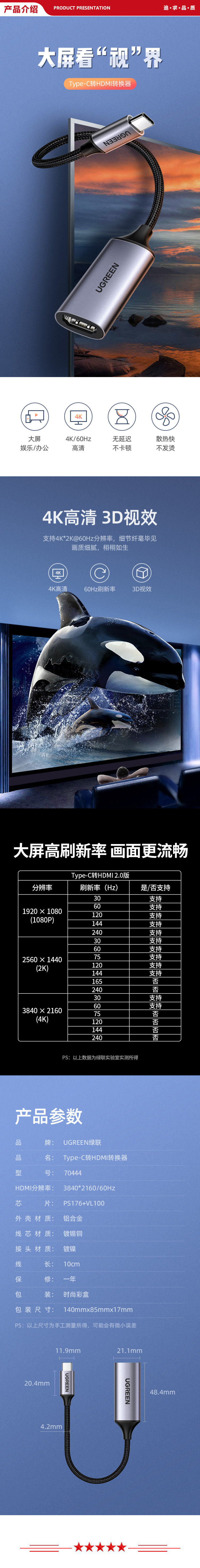 绿联 UGREEN 70444 Type-C转HDMI转接头线 USB-C雷电3转4K60Hz投屏转换器