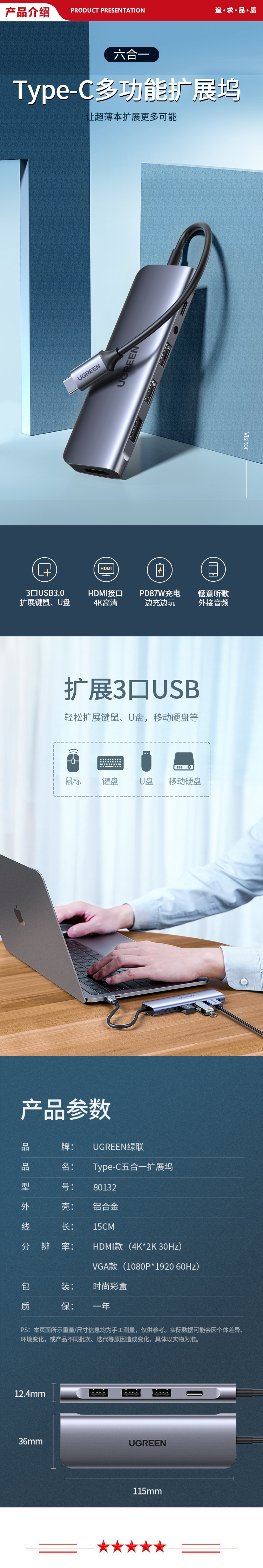 绿联 UGREEN 80132 Type-C扩展坞 通用USB-C转HDMI线4K转换器 雷电3转接头 6合1