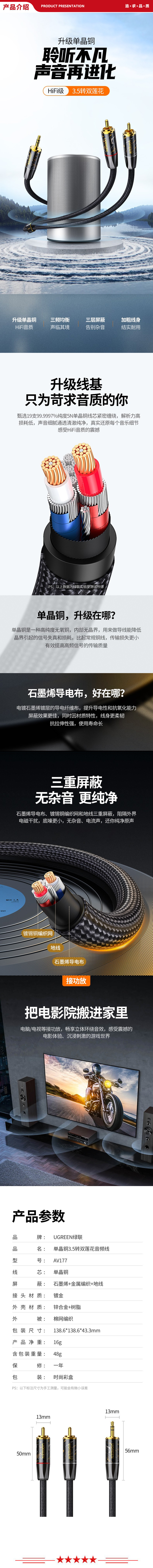 绿联 UGREEN 10961 单晶铜3.5mm转RCA双莲花音频线 AV177 一分二转接线 2米