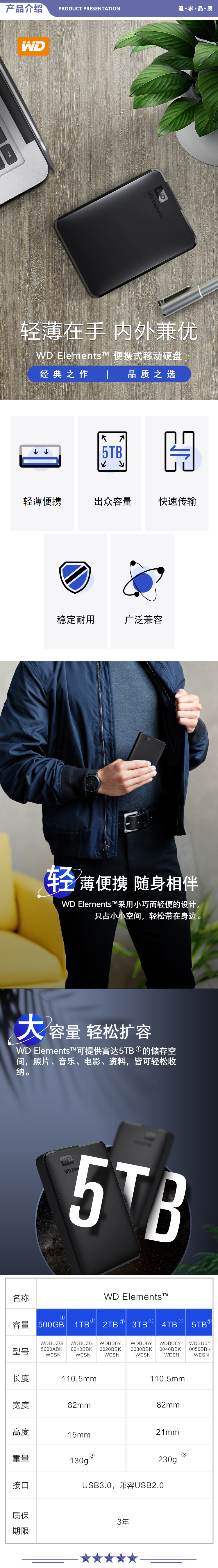 西部数据 WD WDBU6Y0040BBK-WESN 4TB 移动硬盘 USB3.0 Elements 新元素系列2.5英寸 机械硬盘 便携 家用办公