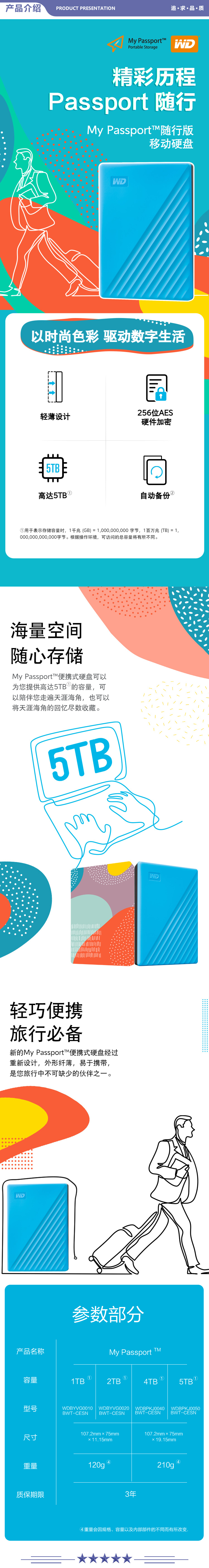 西部数据 WD WDBYVG0010BBL 1TB 移动硬盘 USB3.0 My Passport随行版 2.5英寸 蓝色 机械硬盘 便携 自动备份 兼容Mac