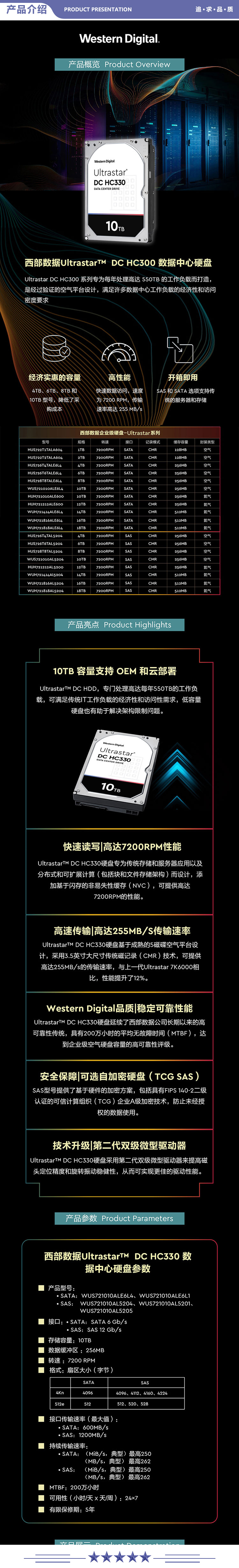 西部数据 WD WUS721010AL5204 10TB 企业级硬盘 HC330 SAS接口 7200转256M