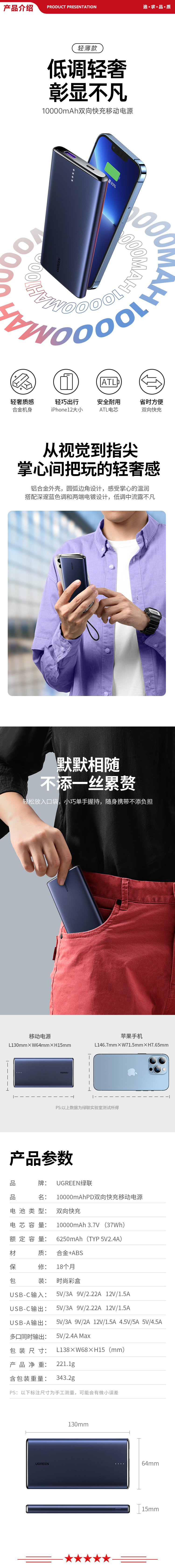 绿联 UGREEN 10428 ATL电芯充电宝 苹果PD20W/华为22.5W快充移动电源 10000mA