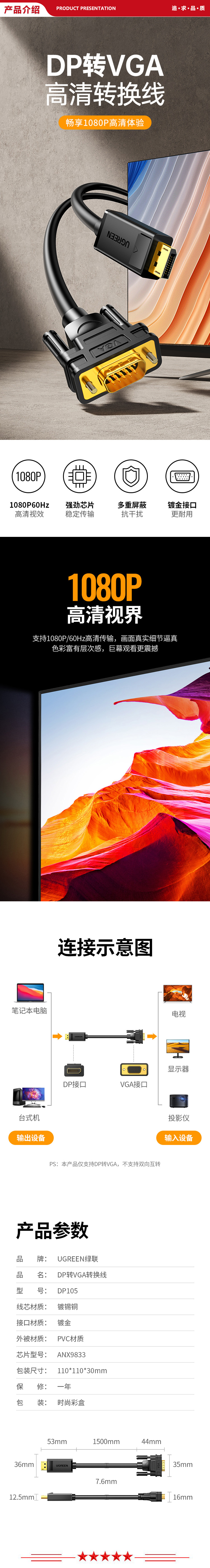绿联 UGREEN 10247 DP转VGA转换线 DP105 DisplayPort转VGA公对公 高清视频连接线 1.5米