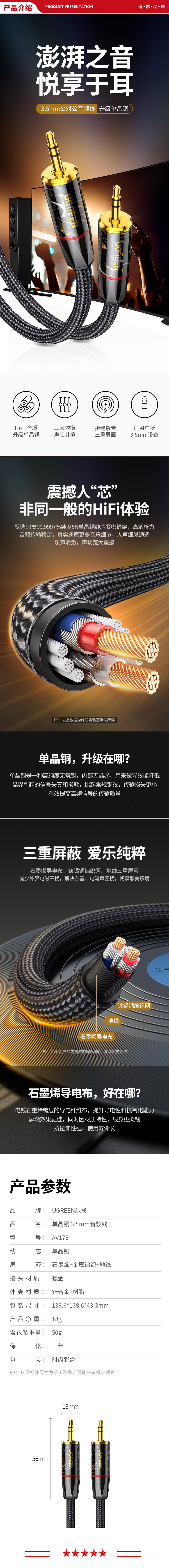 绿联 UGREEN 10956 3.5mm单晶铜音频线 AV175 公对公aux音频线 1米