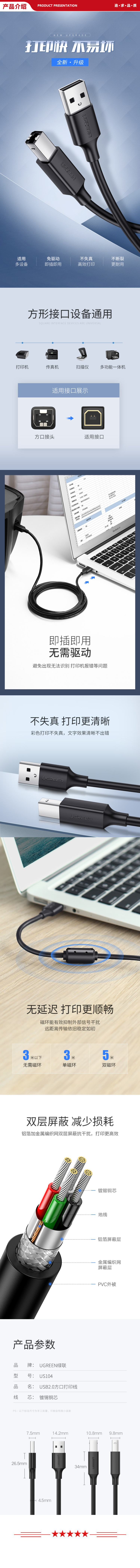 绿联 UGREEN US104 USB2.0 A公对B公打印线 USB打印机数据线计算机延长线长转方口 0.5米