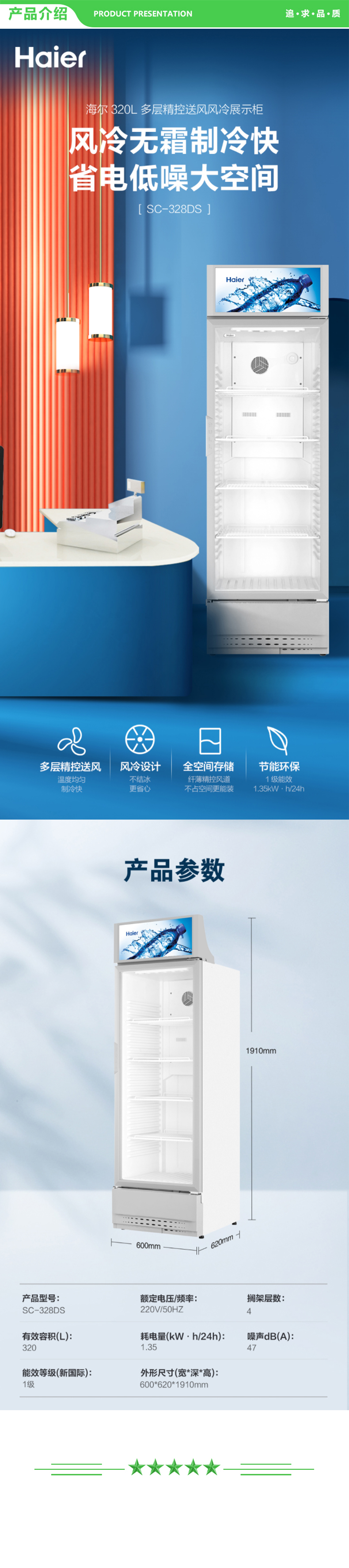 海尔 Haier SC-328DS 320L风冷无霜立式展示柜冰柜 饮料冷藏柜保鲜柜冷柜