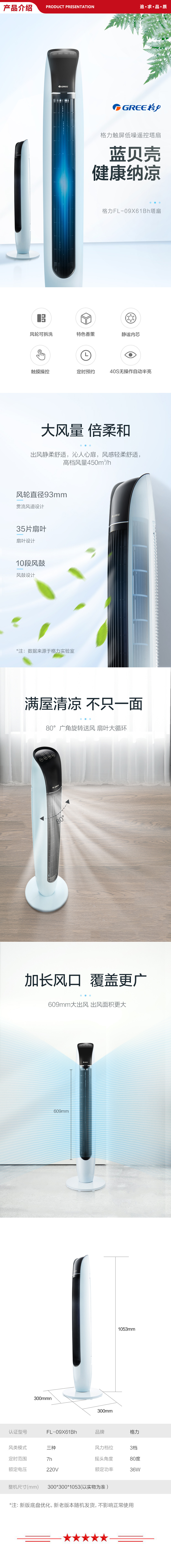 格力 GREE FL-09X61Bh 遥控电风扇/易拆洗节能家用节能塔扇无叶风扇