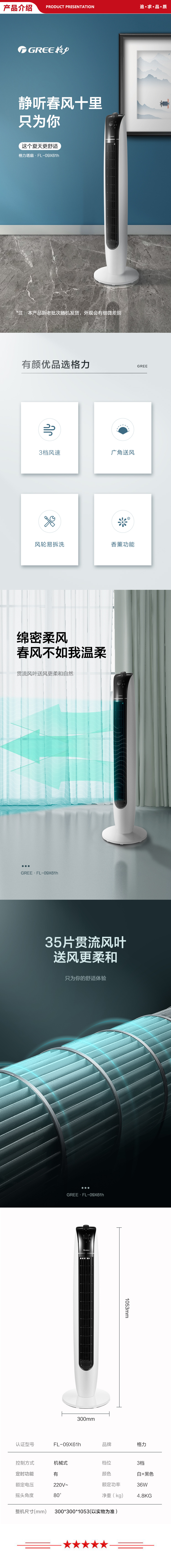 格力 GREE FL-09X61h 家用节能风扇 低噪塔扇 机械无叶风扇