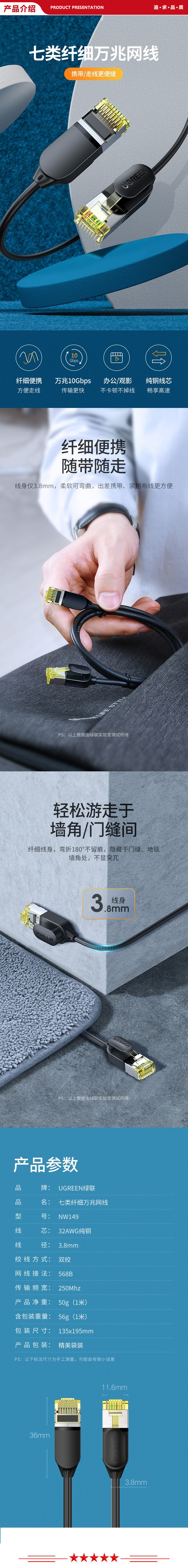 绿联 UGREEN NW149 七类网线 CAT7类八芯双绞纯铜镀金双屏蔽万兆网络跳线 0.5米