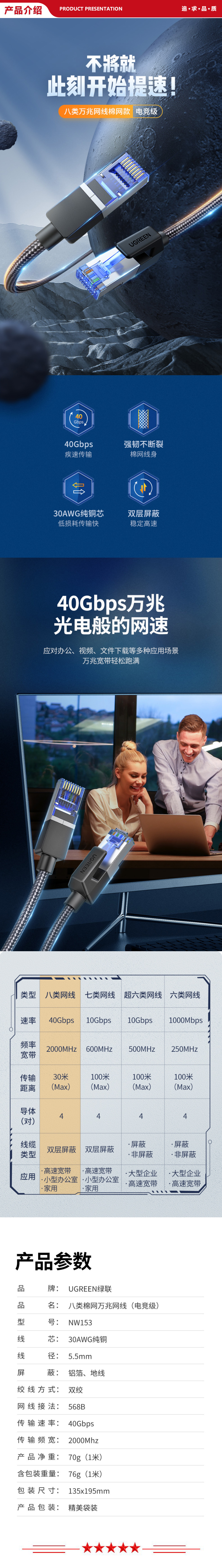 绿联 UGREEN NW153 八类网线 Cat8类万兆网络连接线 纯铜8芯双绞线 电脑宽带网络跳线 3米