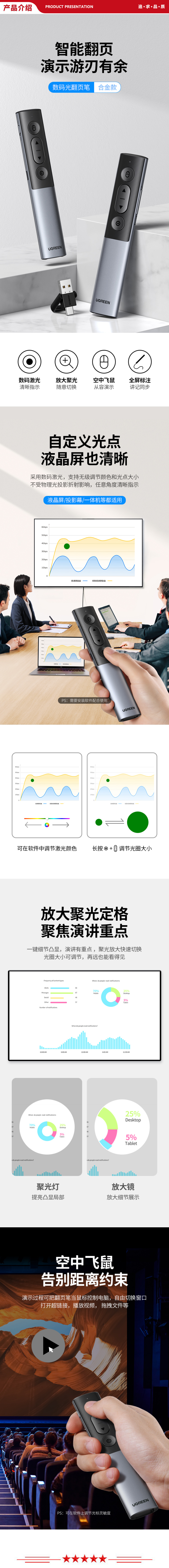 绿联 UGREEN 50333 激光投影翻页笔 放大聚焦凸显无线演示器 数字激光笔