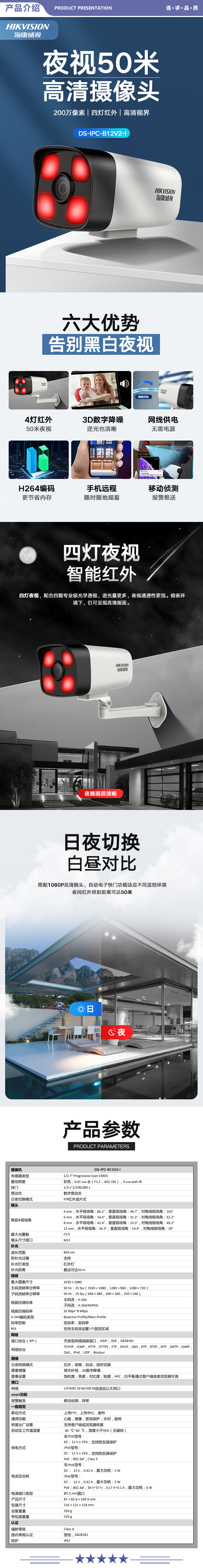 海康威视 HIKVISION B12V2-I 4MM 监控摄像头200万室外监控摄像机红外夜视50米POE网线供电实时侦测手机远程
