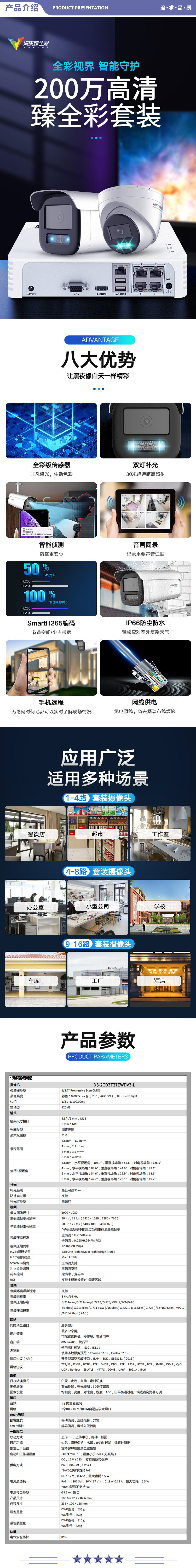 海康威视 HIKVISION 3T27EWDV3L22 监控摄像头套装2路2T硬盘200万高清POE监控器摄像机室内外臻全彩