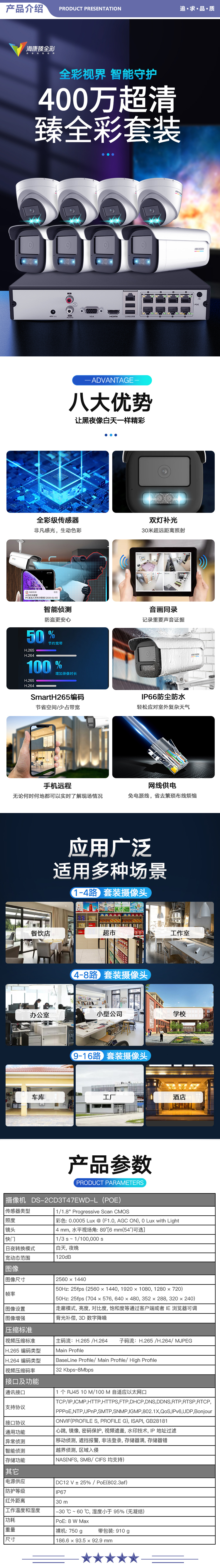 海康威视 HIKVISION 3T47EWDV3L48 监控摄像头套装8路4T400万超高清POE监控器摄像机室内室外臻全彩