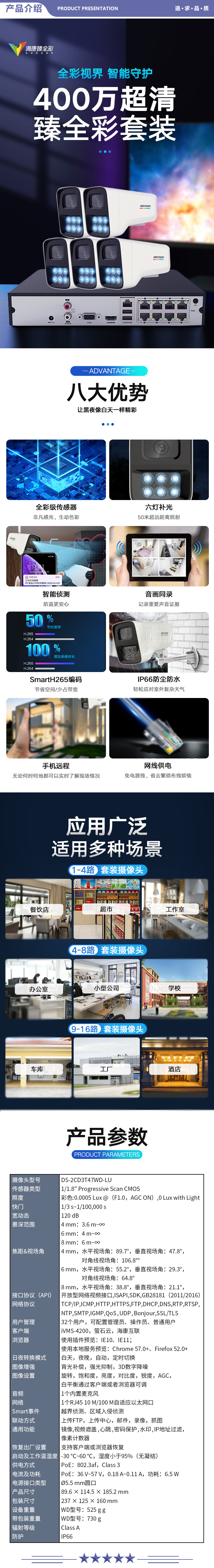 海康威视 HIKVISION 3T47WDLU45 监控摄像头套装5路带4T超高清400万臻全彩夜视监控器摄像机室内外