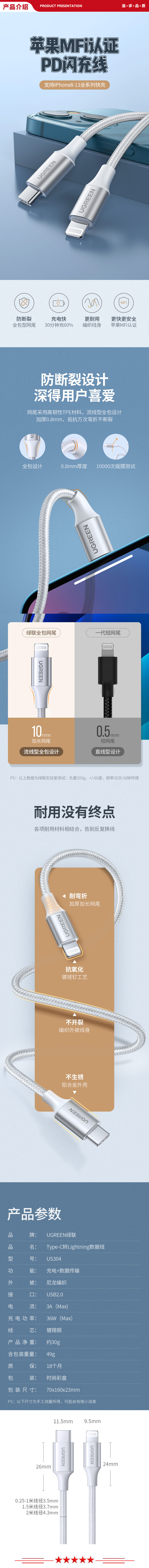 绿联 UGREEN US304 MFi认证苹果编织数据线 通用iPhone Type-C to Lightning充电线 1米/白色