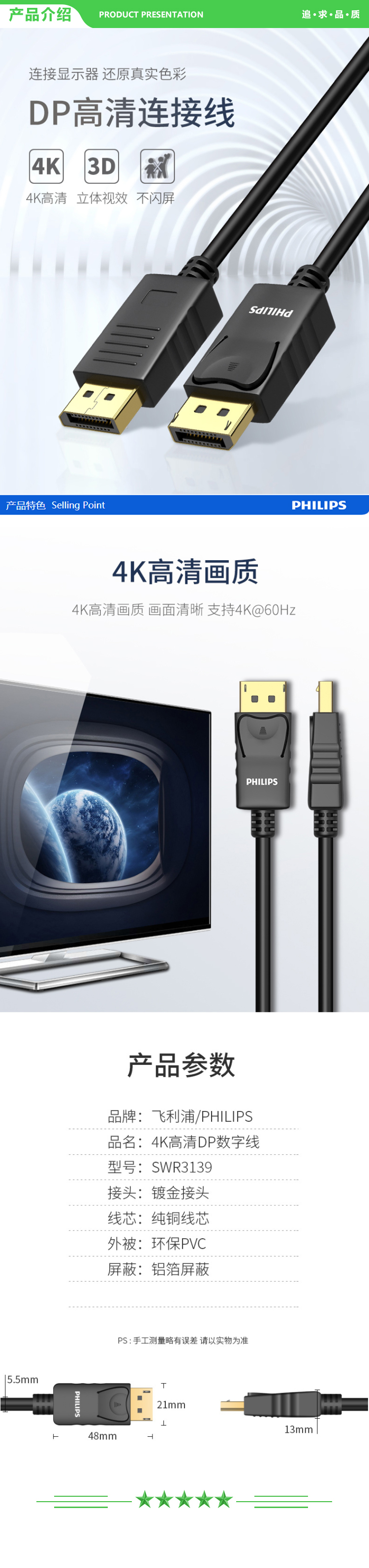 飞利浦 PHILIPS SWR3139A 93 DP线1.2版 2K4K高清线 DisplayPort公对公视频线 1米  .jpg