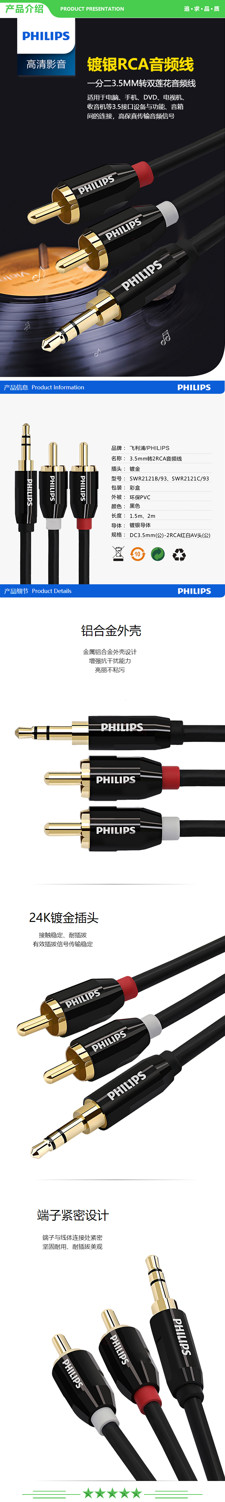 飞利浦 PHILIPS SWR2121B 3.5mm转双莲花 音频线一分二 2RCA公对公连接线 转接线1.5米  .jpg