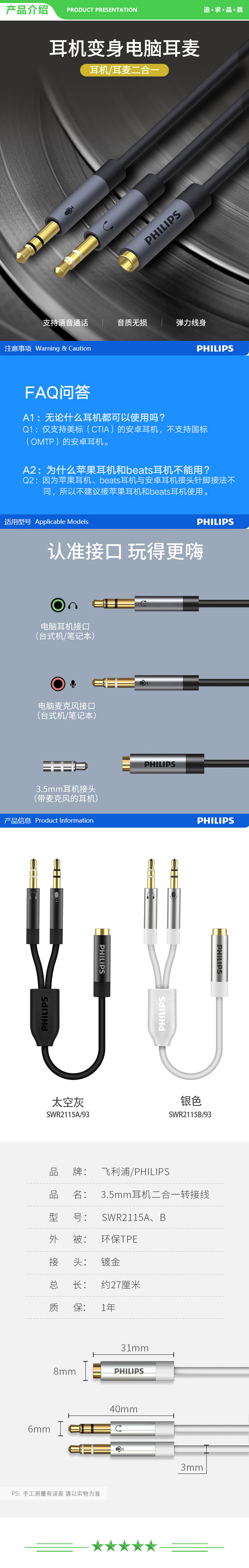 飞利浦 PHILIPS SWR2115A 音频线 耳机麦克风二合一转接线 3.5mm 音频一分二分线器  .jpg