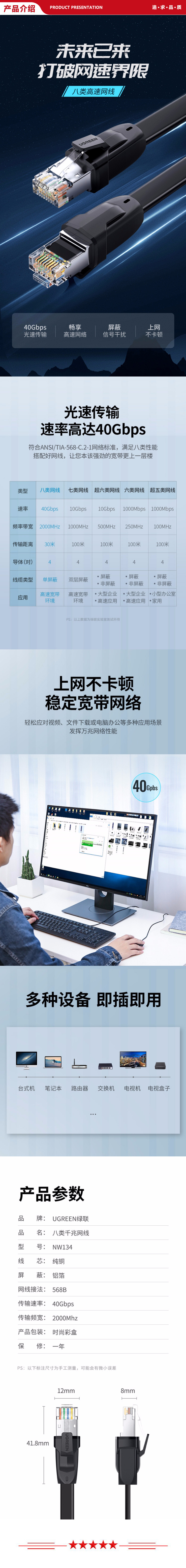绿联 UGREEN 10979 八类网线 NW134 CAT8八芯双绞纯铜镀金带屏蔽高速万兆网络跳线连接线 0.5米扁线