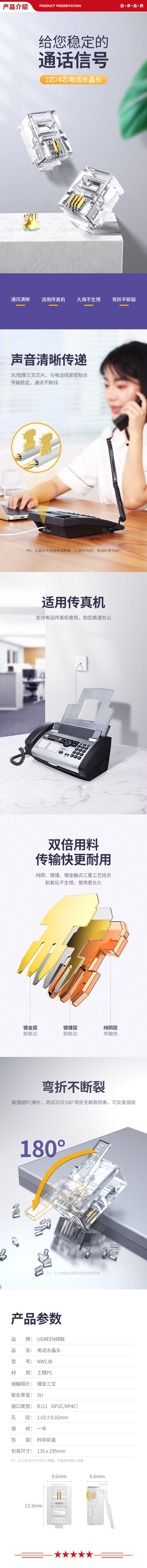 绿联 UGREEN NW138 电话水晶头 80106 6P4C电话线接头 RJ11语音电话线连接器 座机传真机全铜镀金插头 2芯100个装