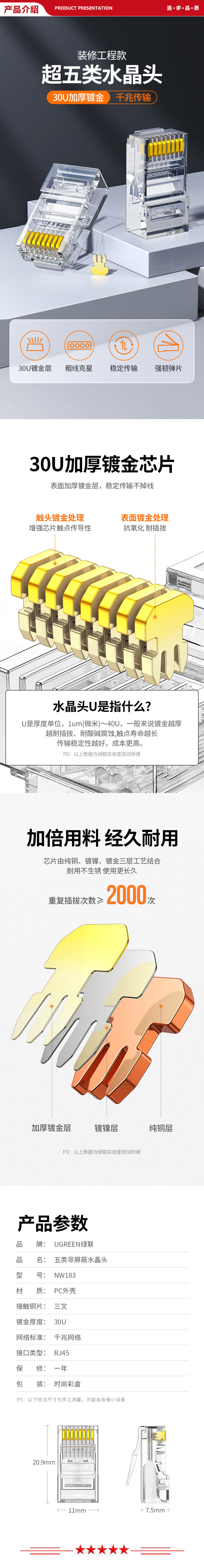 绿联 UGREEN NW183 超五类水晶头 30156 30U加厚镀金网络接头 RJ45工程级8P8C网线 Cat5e接头 100个装