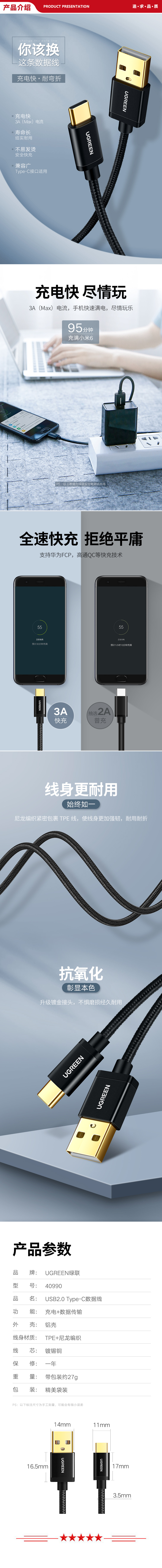 绿联 UGREEN 40990 Type-C数据线 US174 USB-C安卓充电线快充线 1.5米