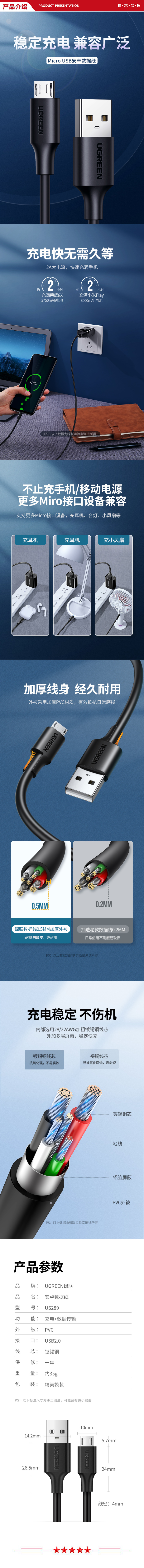 绿联 UGREEN US289 USB2.0公转Micro5p数据线 60137 安卓数据线快充micro usb蓝牙耳机充电宝线 1.5米/黑色