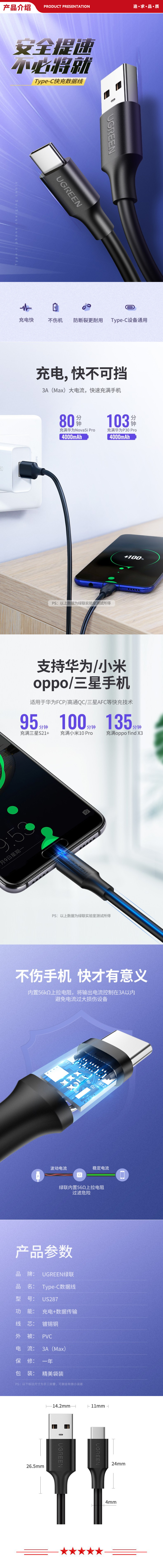绿联 UGREEN US287 TYPE-C快充线 3A快充USB TYPE C公转USB2.0公连接线 3米/黑色