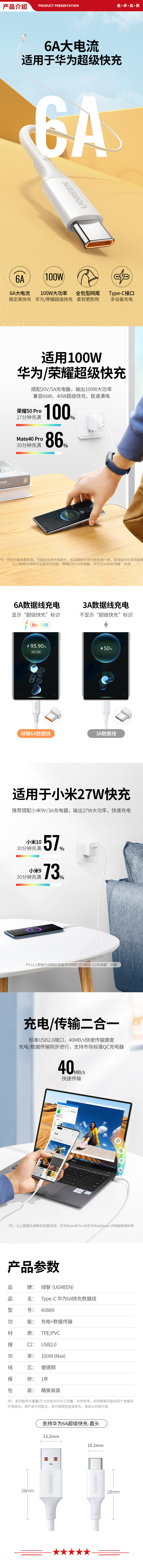 绿联 UGREEN US253 Type-C数据线 60727 6A超级快充线 1米/黑色