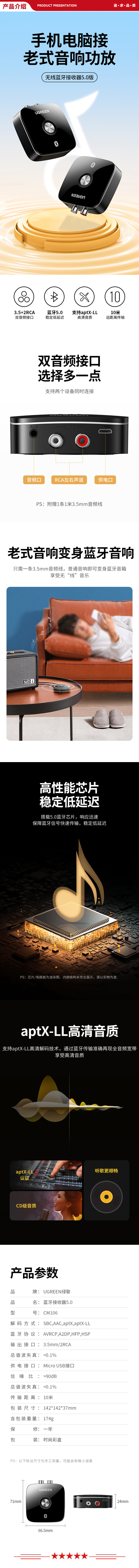 绿联 UGREEN CM106 蓝牙适配器5.0免驱 40759 AUX车载音响箱接收器3.5mm转2RCA双莲花aptx无线音频接功放