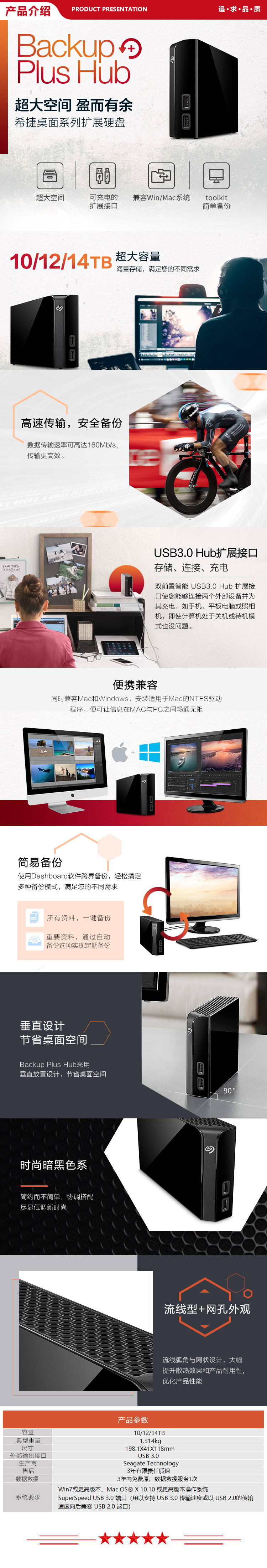 希捷 Seagate STEL10000400 桌面移动硬盘 HUB系列 10TB 3.5英寸 大容量存储 带USB3.0拓展