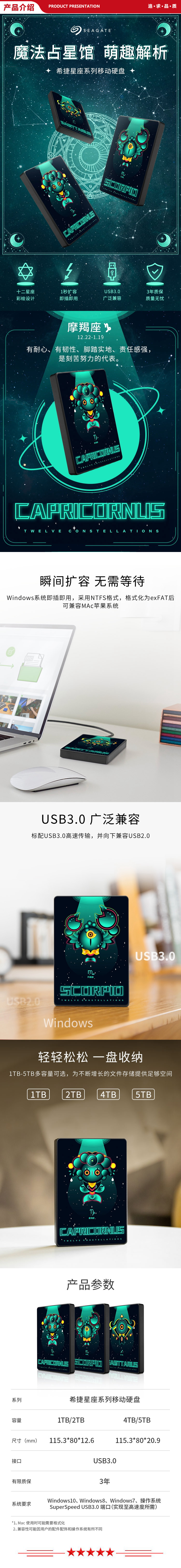 希捷 Seagate STGX2000400 移动机械硬盘 2TB 十二星座系列-摩羯座 高速 便携 2.5英寸 USB3.0 兼容MAC 个性彩绘