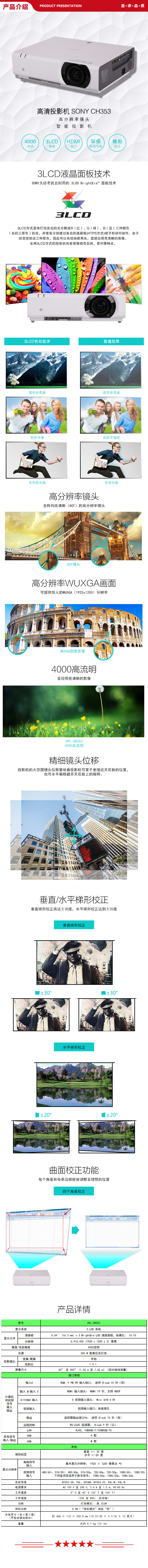 索尼 SONY VPL-CH353 投影仪 投影机办公(超高清WUXGA 4000流明 中大型会议 镜头移位)