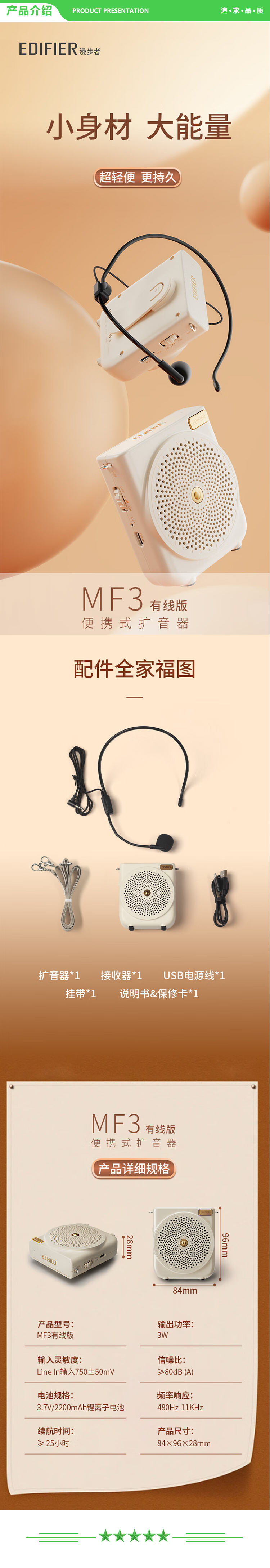 漫步者 EDIFIER MF3 有线版便携式扩音器 小蜜蜂大功率教学专用教师导游扩音器 唱戏机 云岩白 .jpg