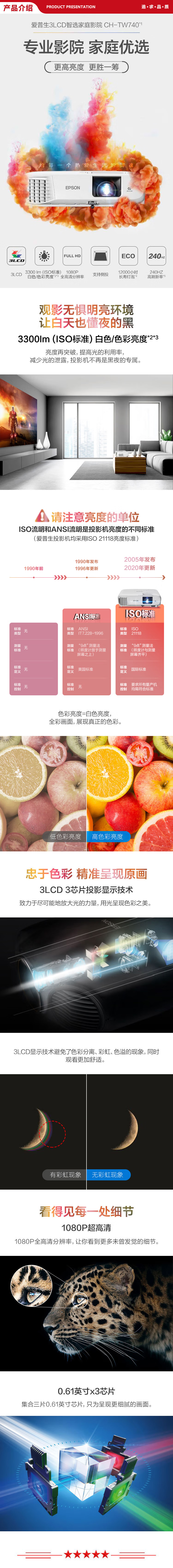 爱普生 EPSON CH-TW740 家用投影仪 投影机(3300流明 240HZ高刷新率 1.35倍数码变焦)+落地支架