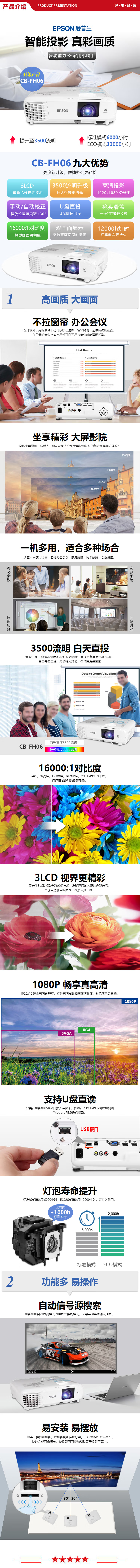 爱普生 EPSON CB-FH06 投影仪 投影机办公(1080P全高清 3500流明 支持侧投)+吊架