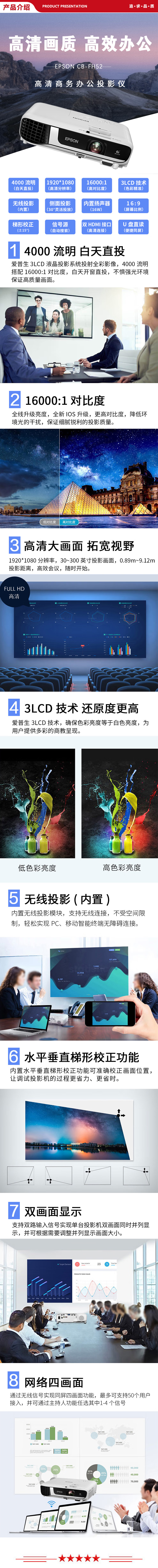 爱普生 EPSON CB-FH52 投影仪 投影机办公(1080P全高清 4000流明 手机同屏 1.6倍变焦)+100英寸电动幕布