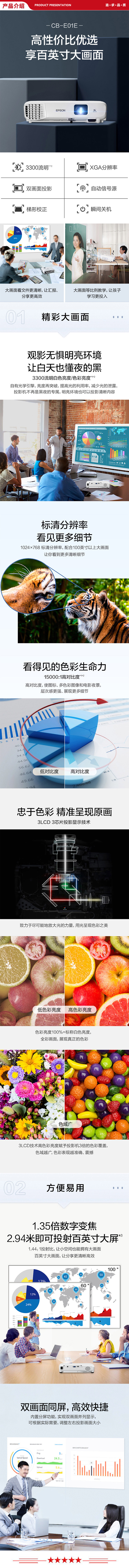 爱普生 EPSON CB-E01E 投影仪 投影机办公(标清XGA 3300流明 高清接口 支持侧投 数码变焦)+吊架