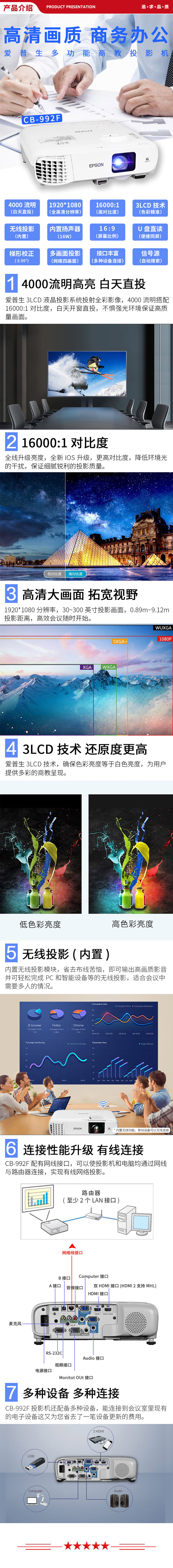 爱普生 EPSON CB-992F 投影机 投影仪办公培训(4000流明 1080p全高清 双HDMI接口 支持侧投)+吊架+HDMI线+激光笔