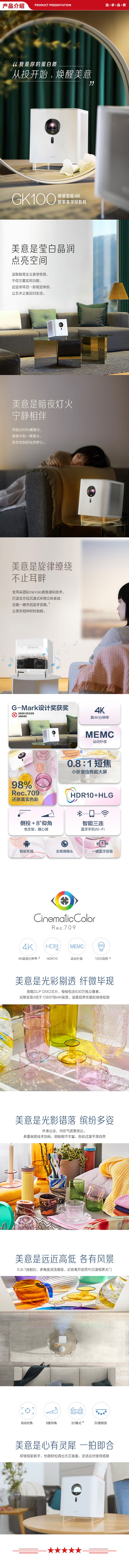 明基 BenQ GK100 智能投影仪 投影机 家用(4K超高清 短焦投影 自动对焦 左右梯形校正 支持MEMC HDR 10)