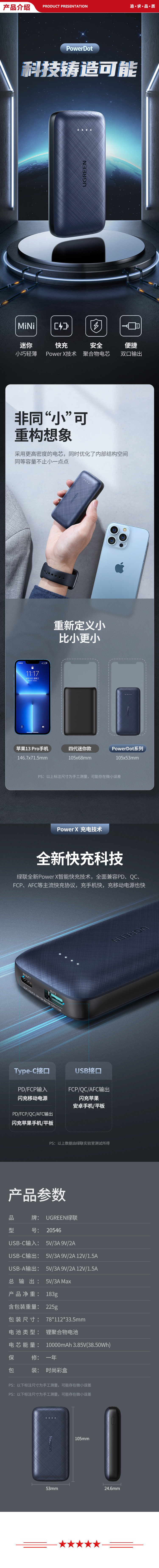 绿联 UGREEN 20546 充电宝10000mA 苹果PD20W兼容18W 迷你便携小巧移动电源