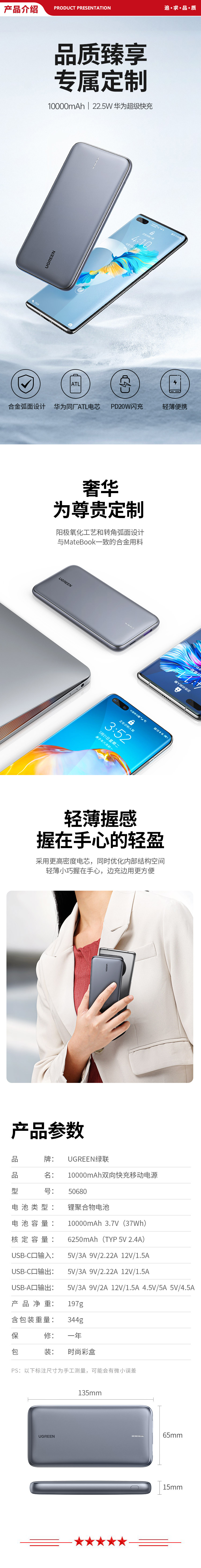 绿联 UGREEN 50680 充电宝10000mA 支持苹果PD20W/华为22.5W 轻薄便携移动电源
