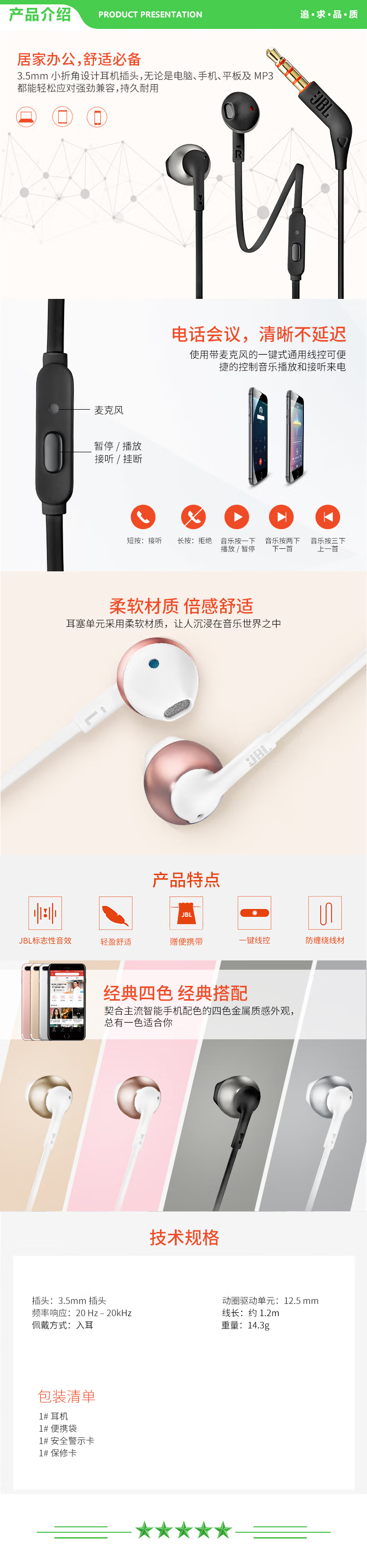 JBL T205 半入耳式耳机 TUNE205手机耳机 有线运动耳机 带麦克风 苹果安卓系统通用 香槟金 .jpg