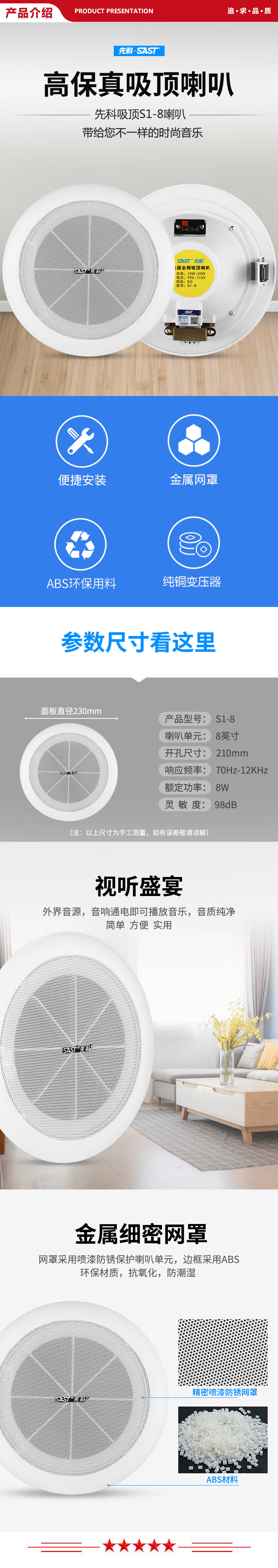 先科 SAST S1-8 定压吸顶喇叭音响 吊顶背景音乐公共广播 8英寸