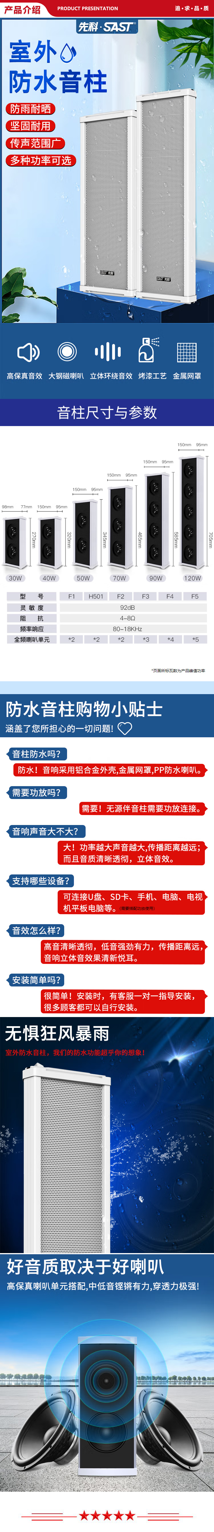先科 SAST F2 室外防水音柱音响 户外定压壁挂音响学校广播喇叭 50W