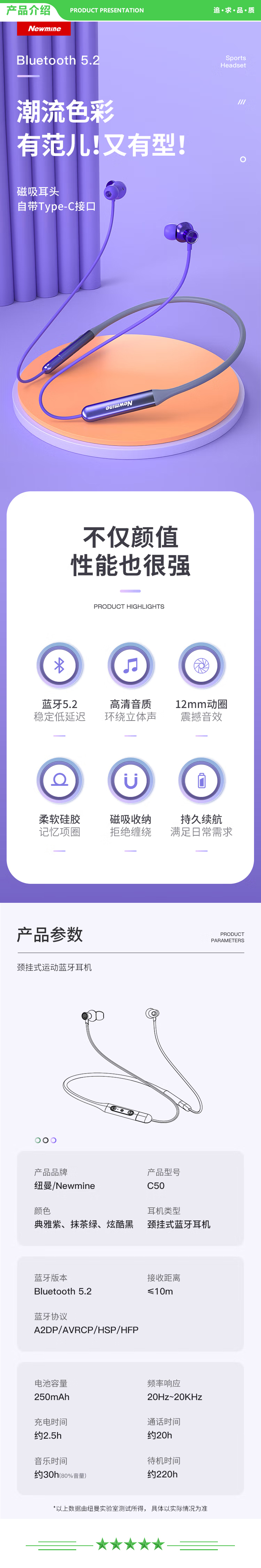 纽曼 Newmine C50 渐变紫 磁吸入耳式 挂脖颈挂式无线运动蓝牙线控耳机 手机耳机 音乐耳机 带麦可通话