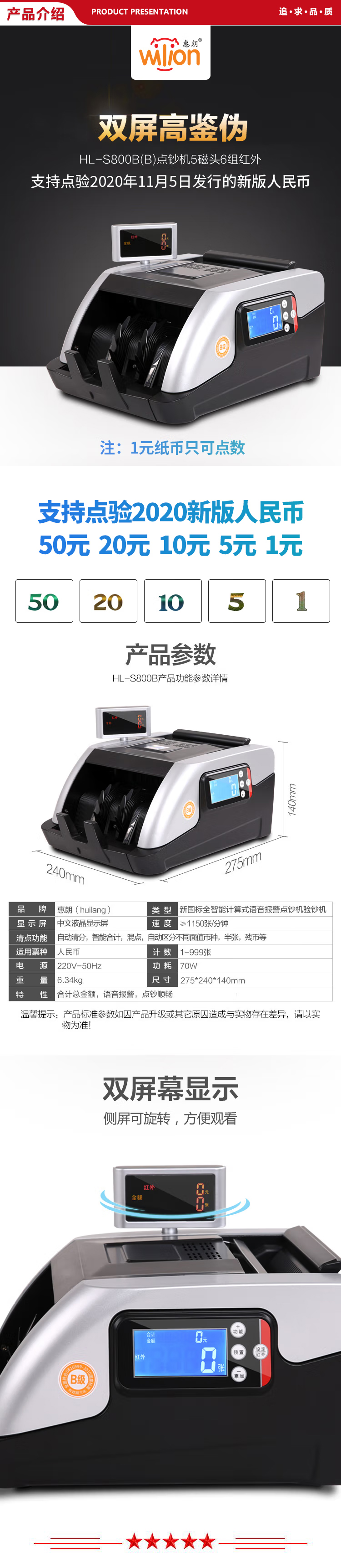 惠朗 huilang HL-S800B 新版人民币验钞机 B类点钞机 支持新旧款人民币混点