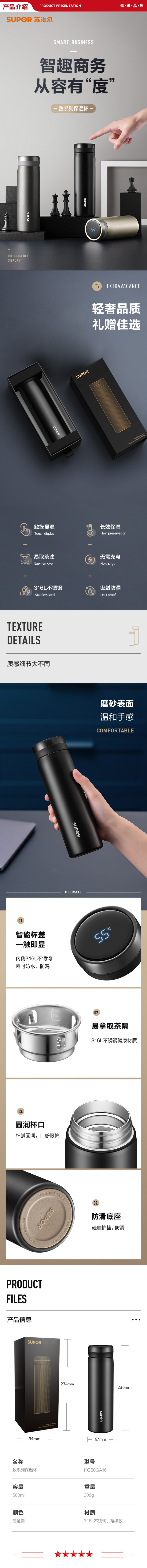苏泊尔 SUPOR KC50GA16 大容量智能保温杯 学生户外便携直身弹盖车载恒温316L不锈钢保温水杯 500mL儒雅黑
